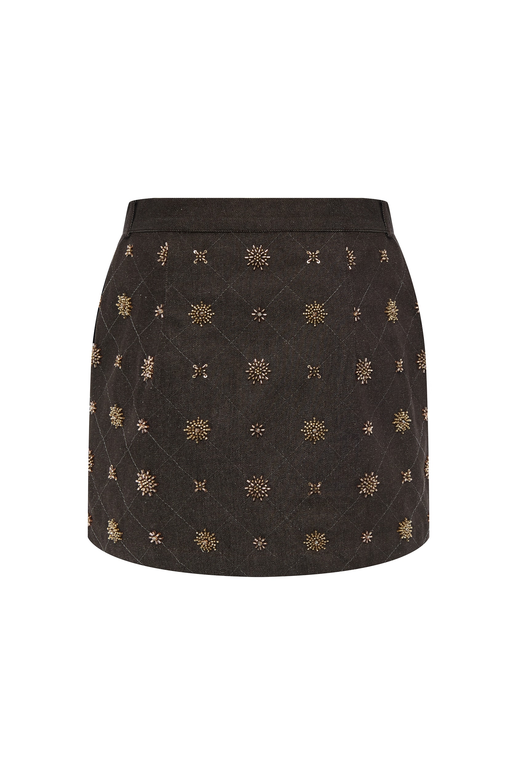 Лаконичный крой мини гармонично сочетается с прочной джинсовой тканью и утончённой вышивкой из стекляруса, создавая образ, который одновременно строгий и изысканный.