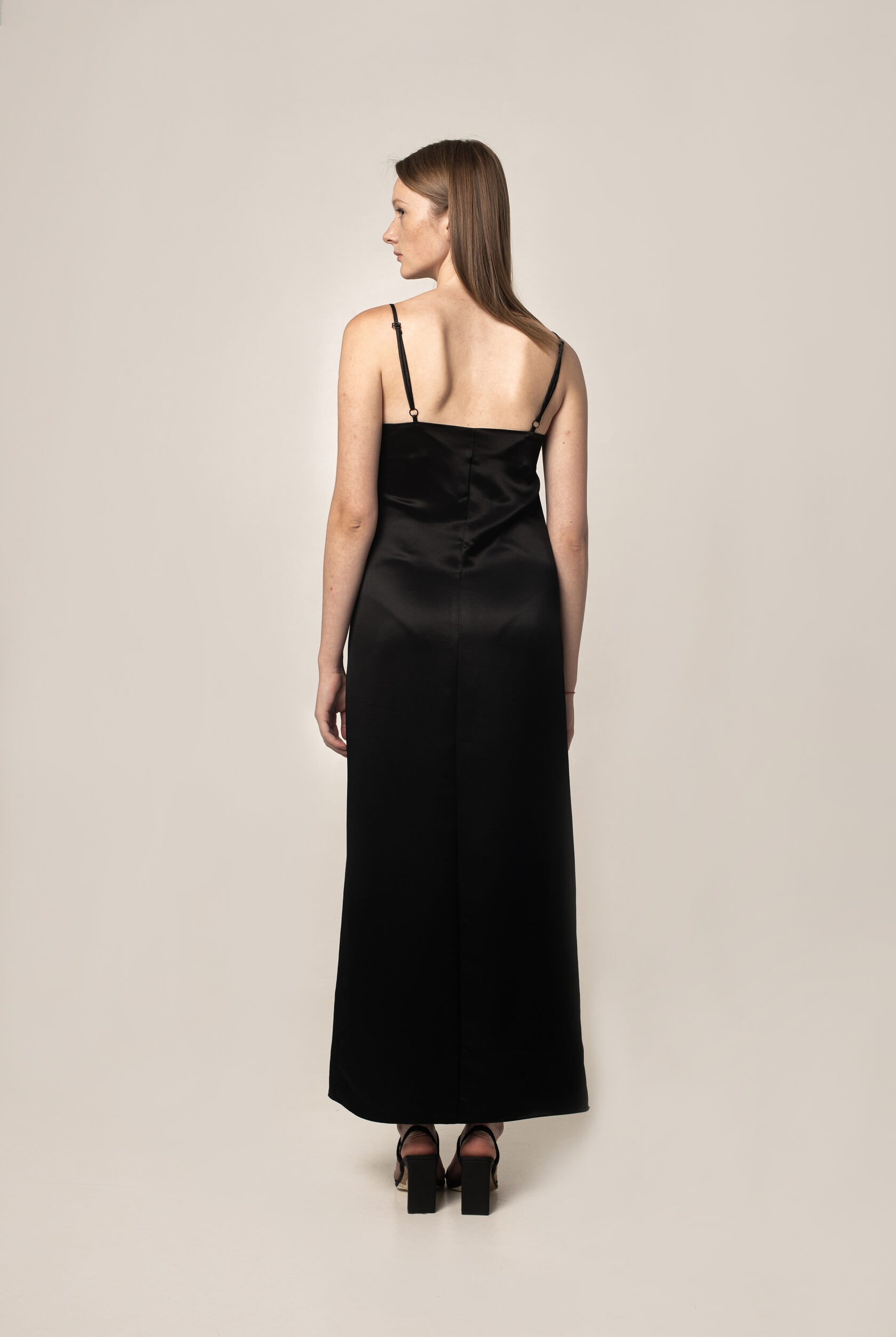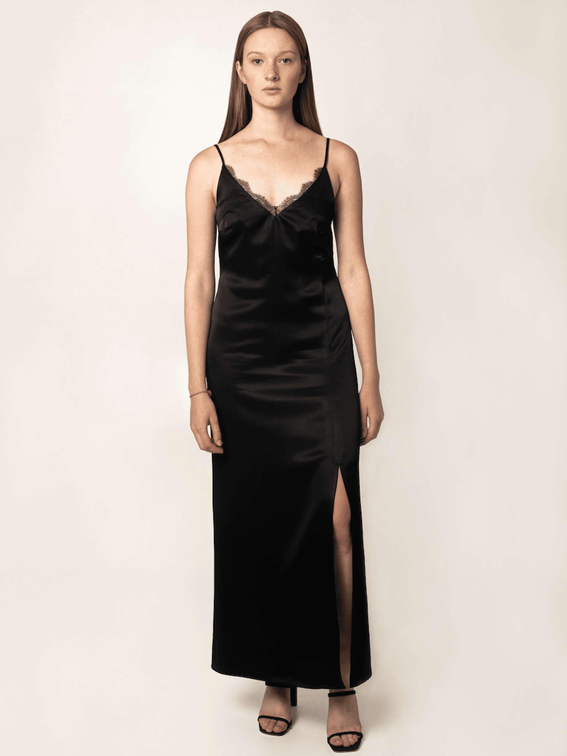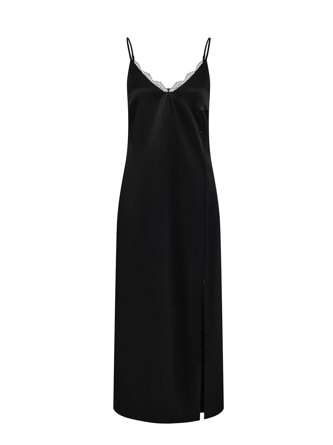 Тонкие бретели и прямой крой создают лёгкость, а деликатный боковой разрез привносит ту самую «немного опасную» женственность.