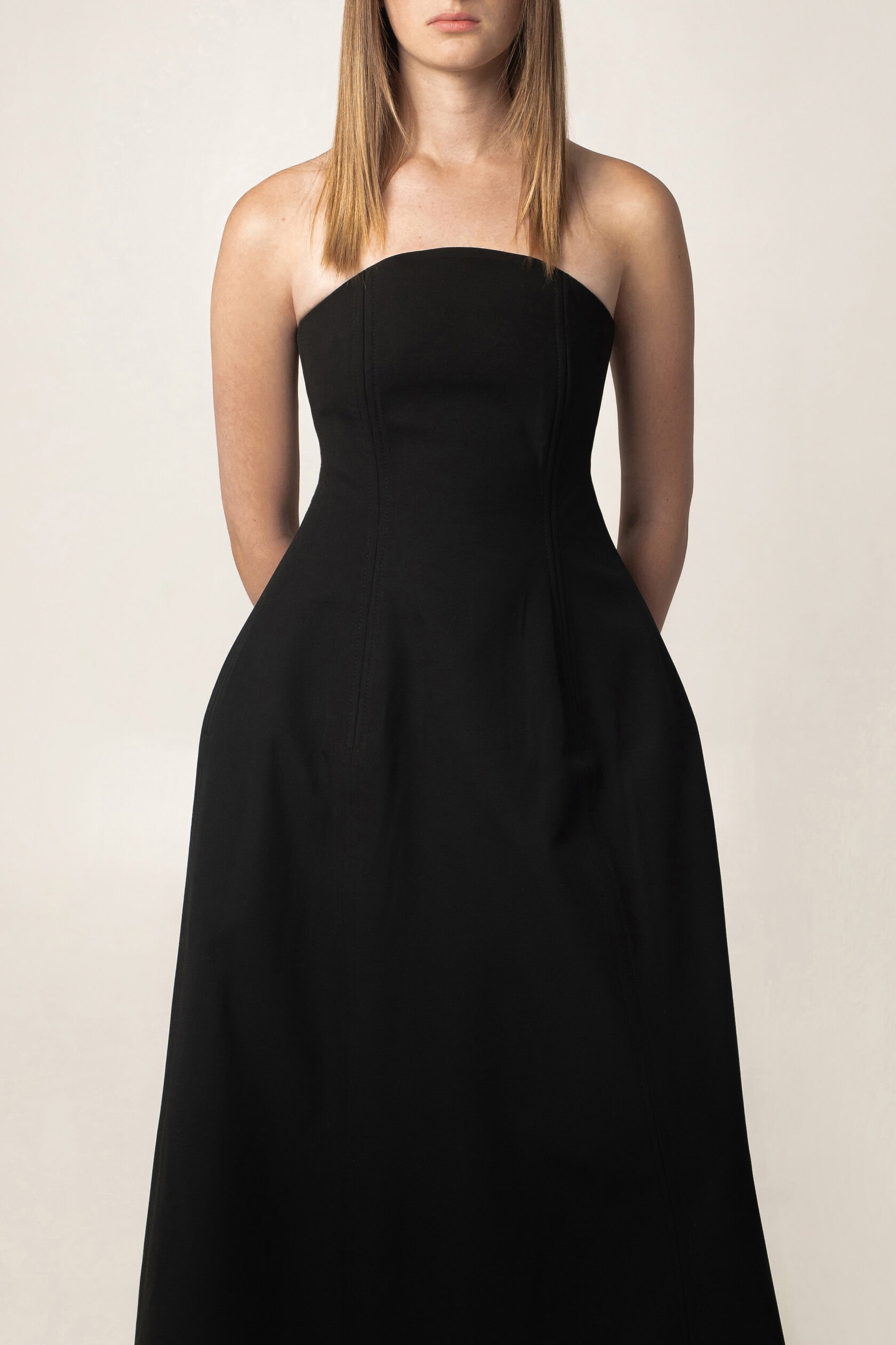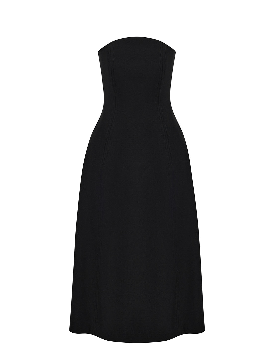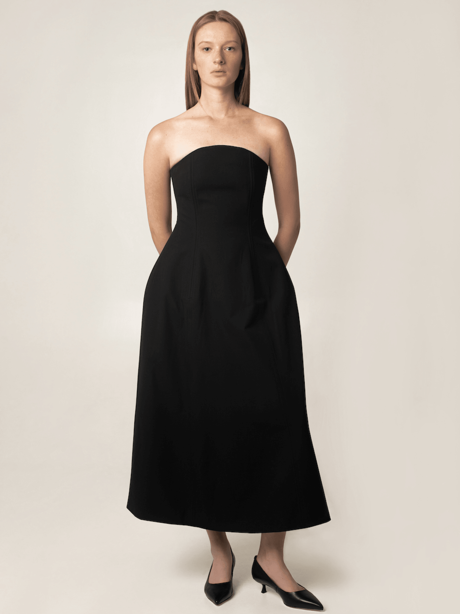 Элегантное черное платье без бретелей создано по мотивам легендарного силуэта New Look.