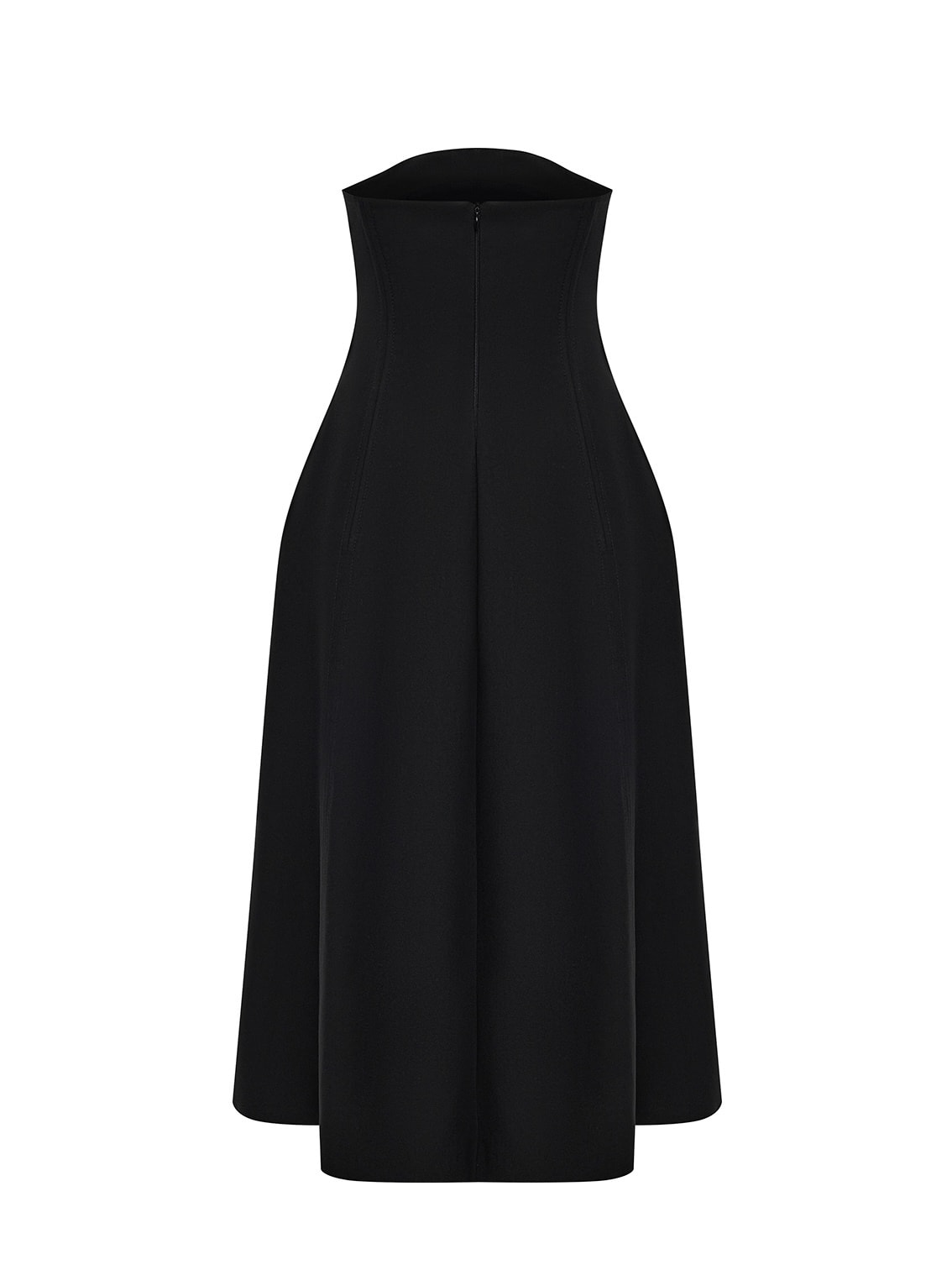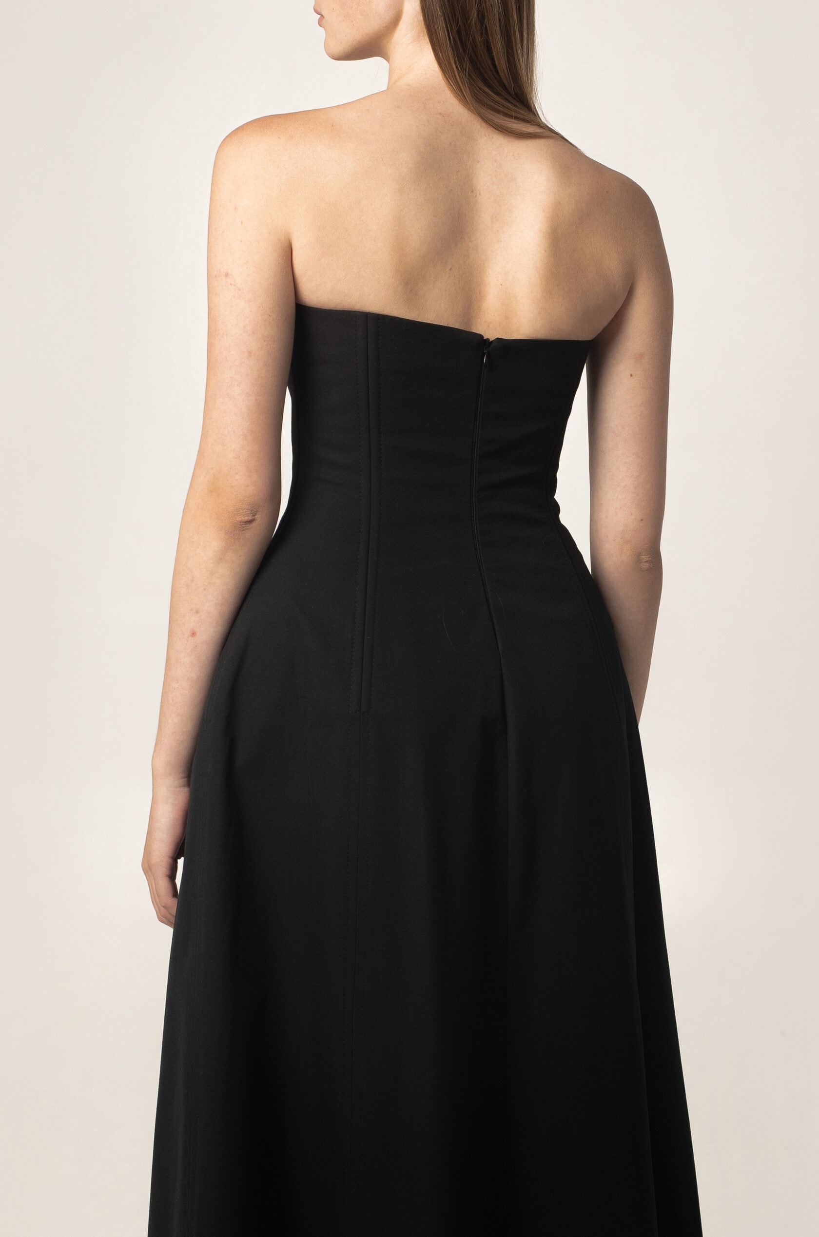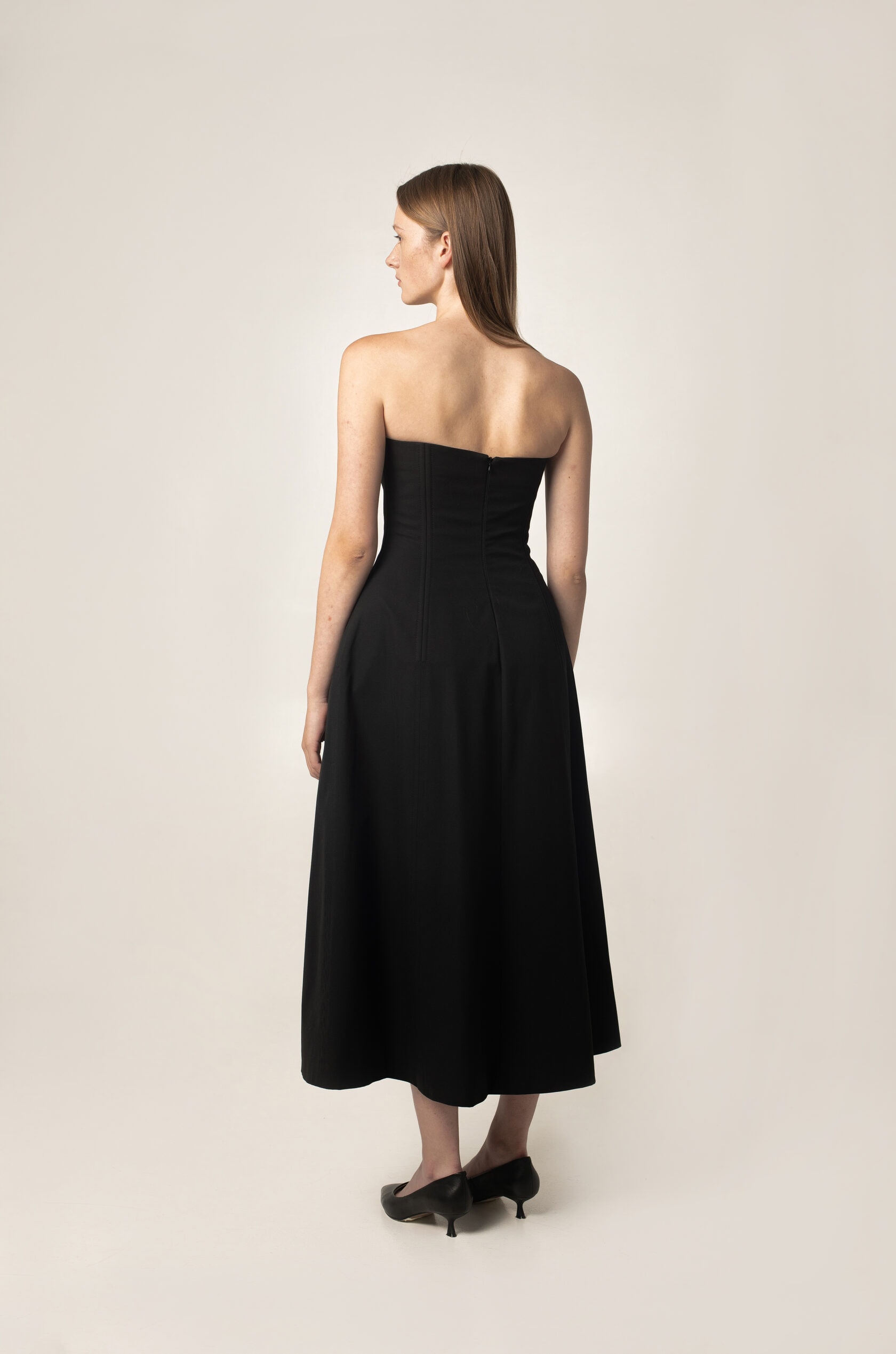 Элегантное черное платье без бретелей создано по мотивам легендарного силуэта New Look.