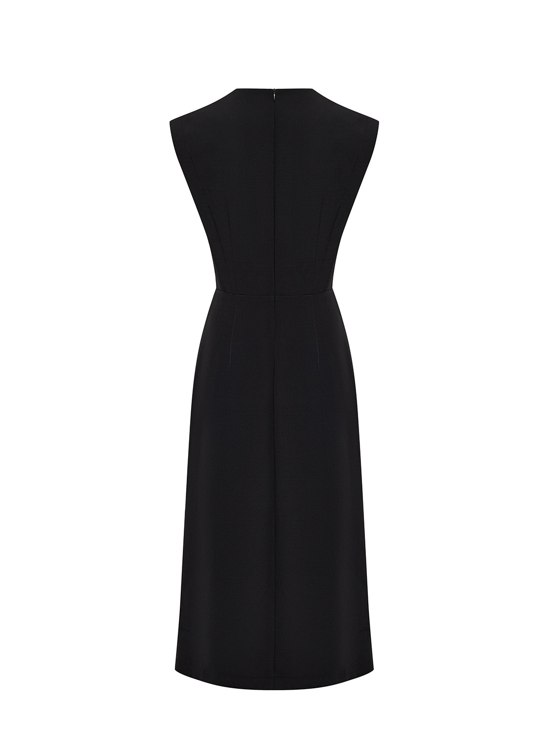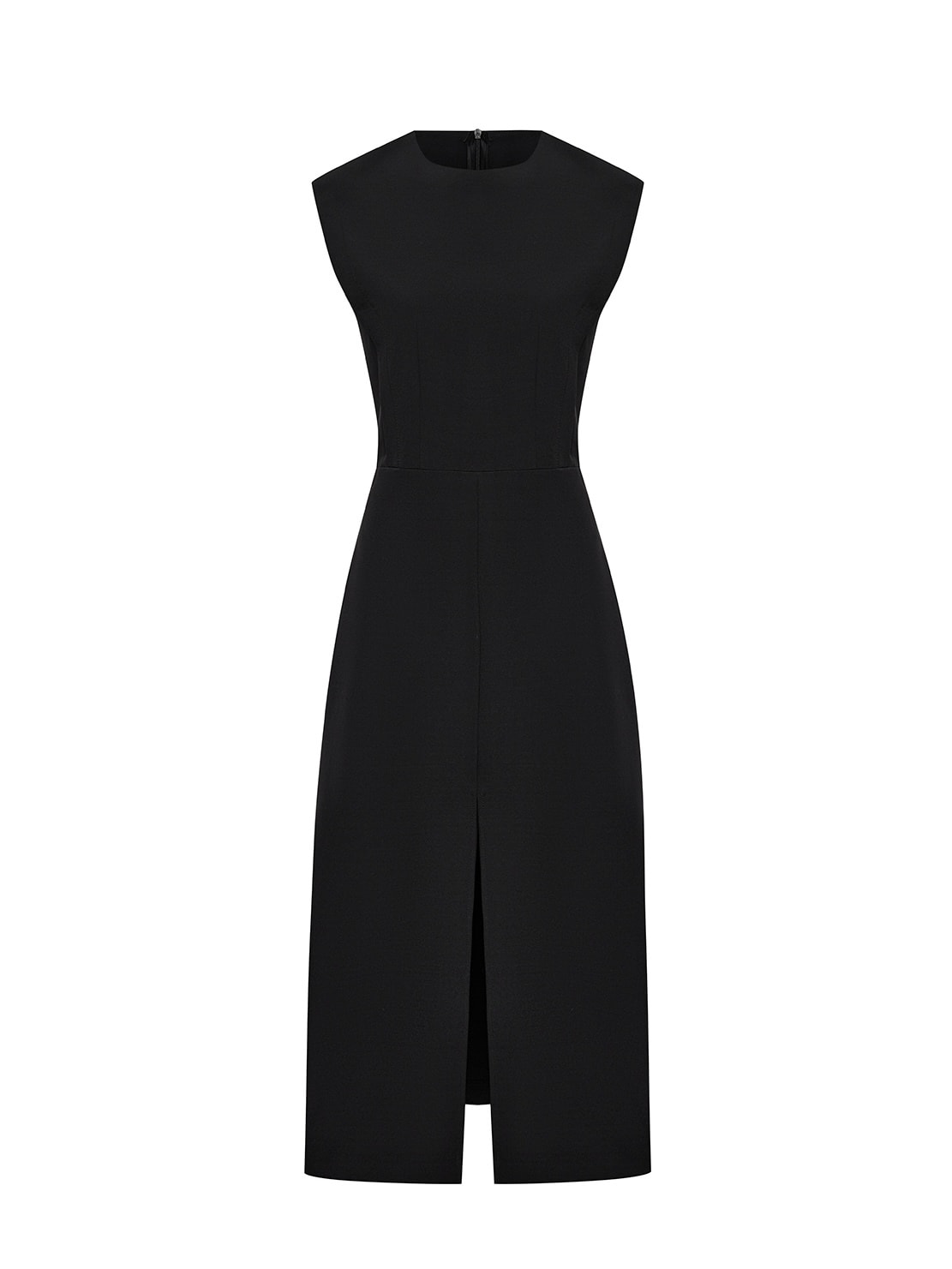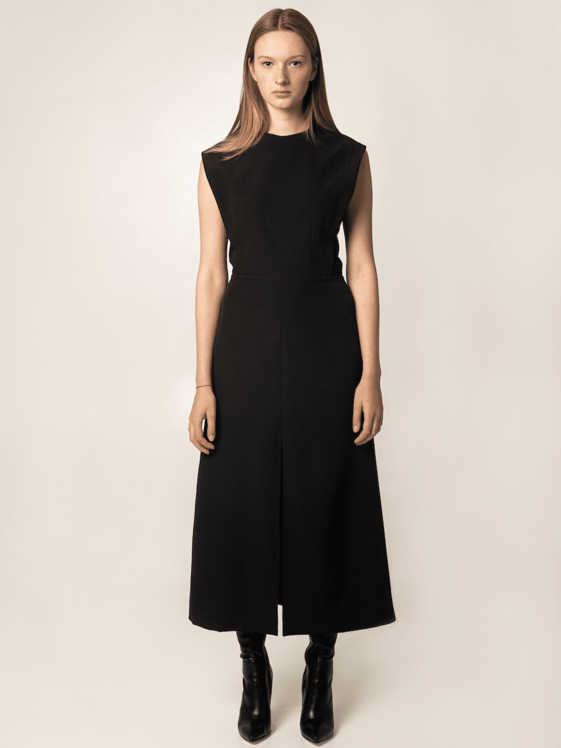 Продольный разрез спереди добавляет лёгкого движения и визуально вытягивает фигуру, сохраняя образ строгим но женственным.
