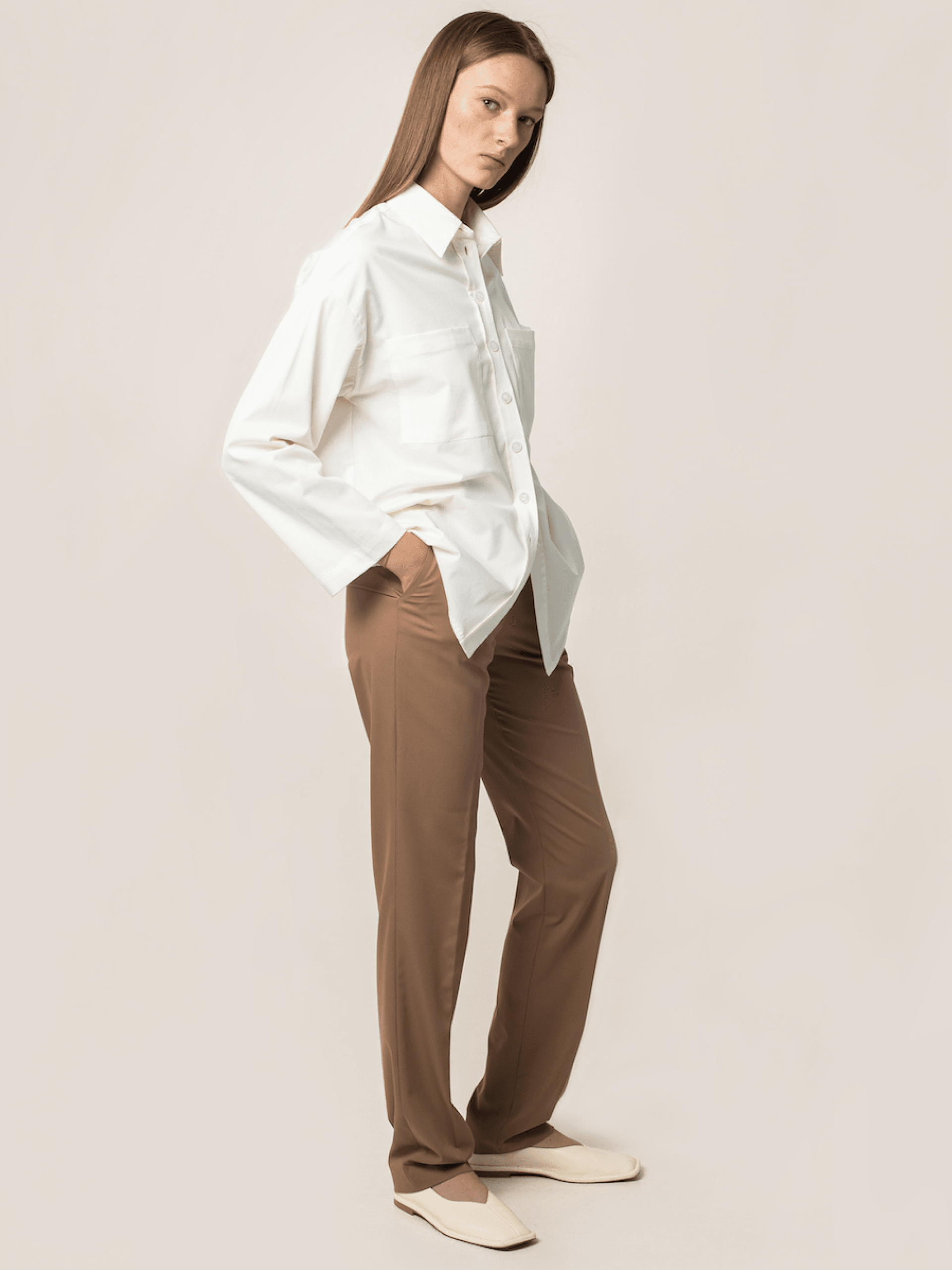 Отлично смотрится с брюками-палаццо или брюками другого кроя, а такж же - классическим денимом.