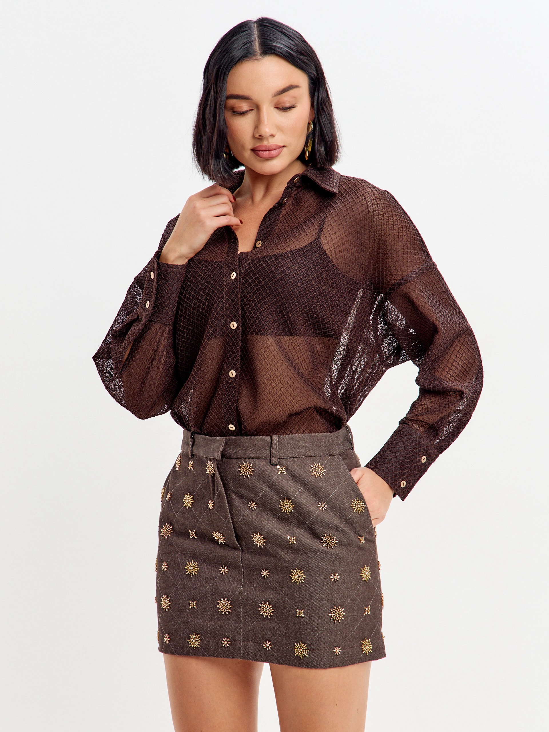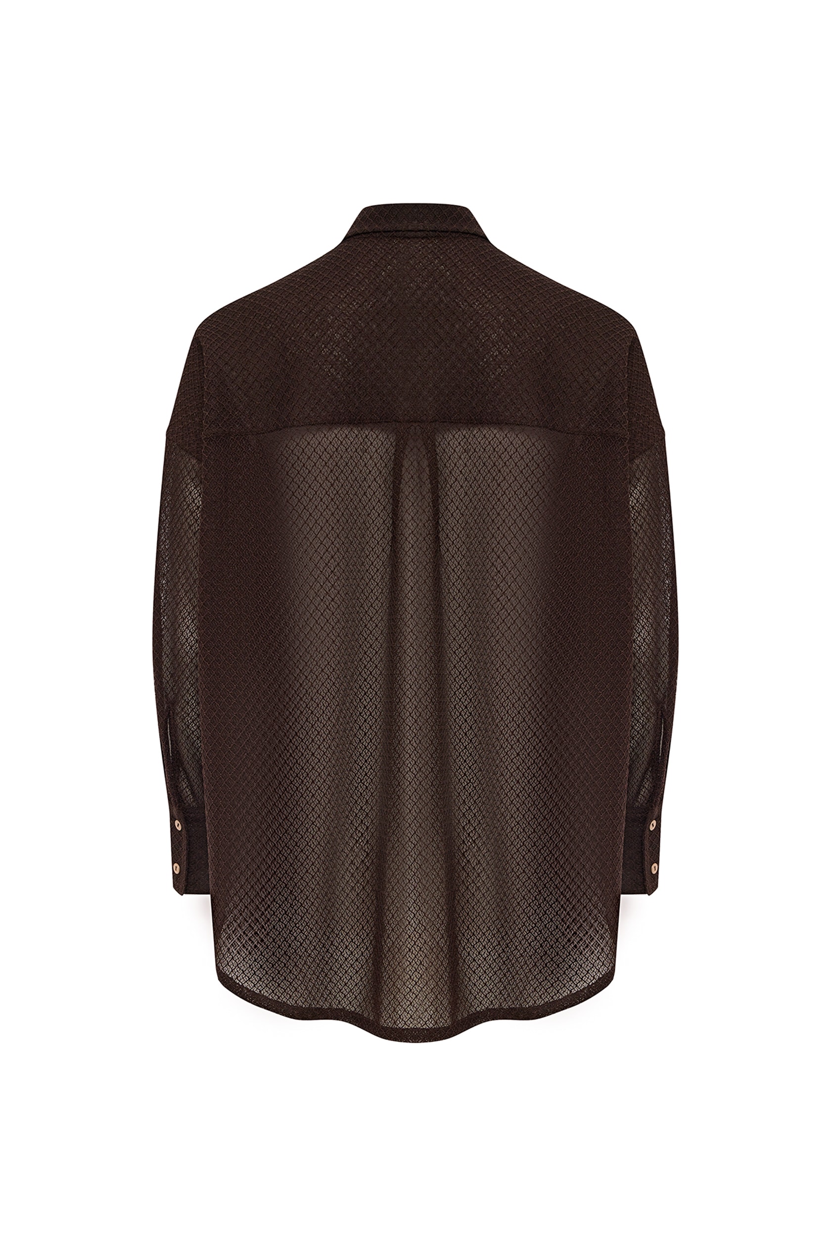 Рубашка свободного кроя из лёгкой полупрозрачной ткани с изящным геометрическим узором придаст вашему образу изысканность и лёгкость.