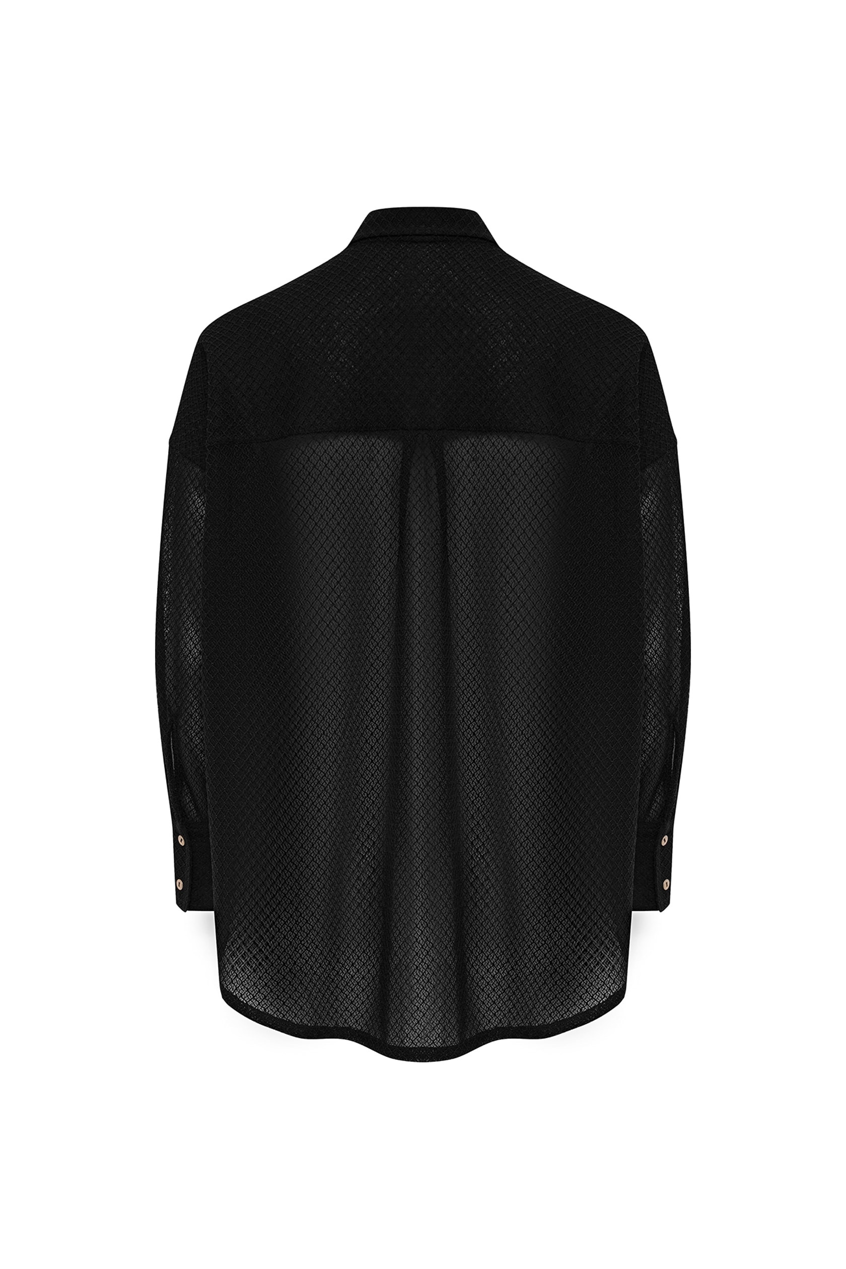 Лёгкая полупрозрачная ткань с утончённым геометрическим узором создаёт эффект воздушности, а классический воротник и аккуратная планка с золотыми пуговицами придают образу изысканность.