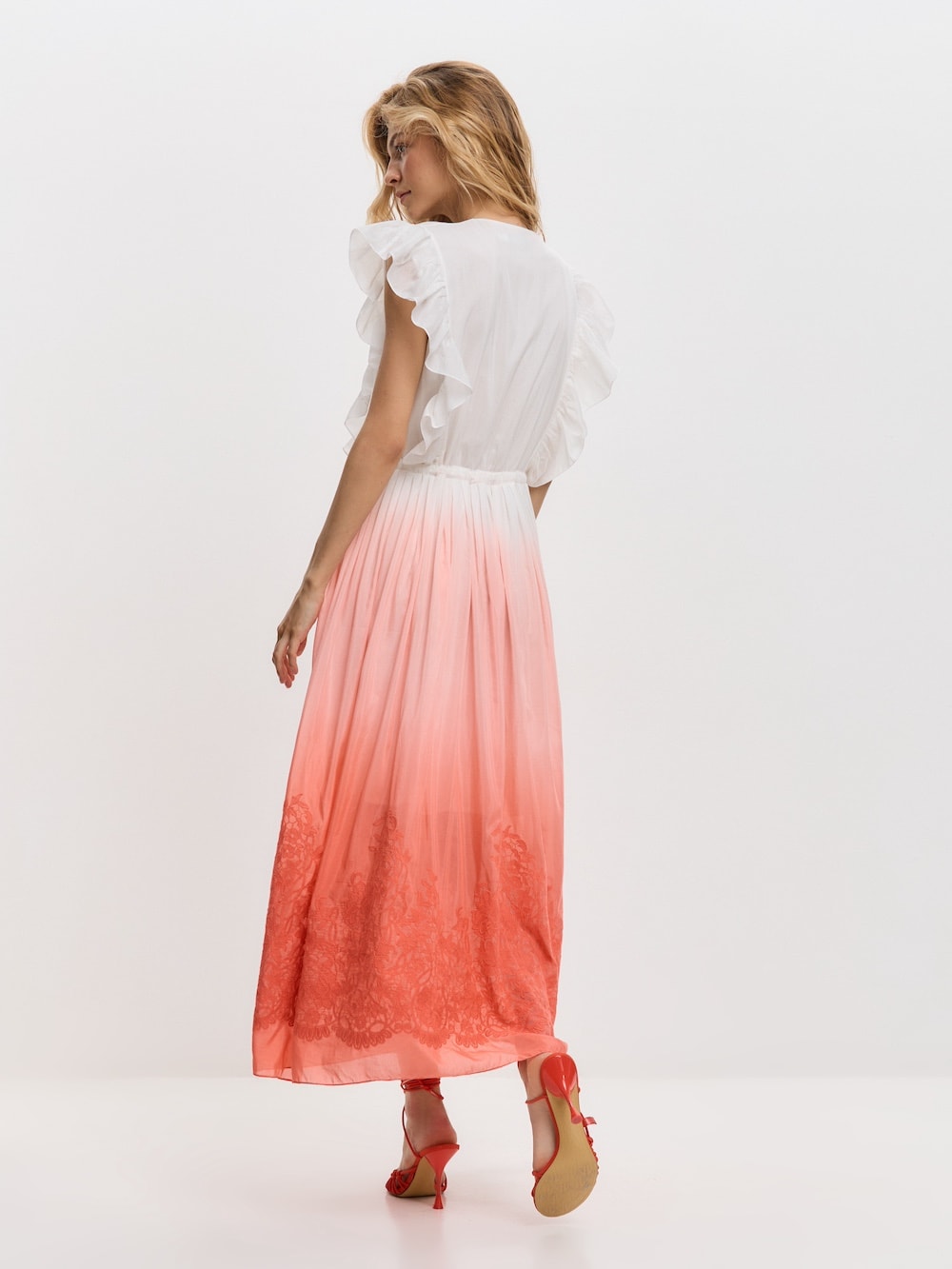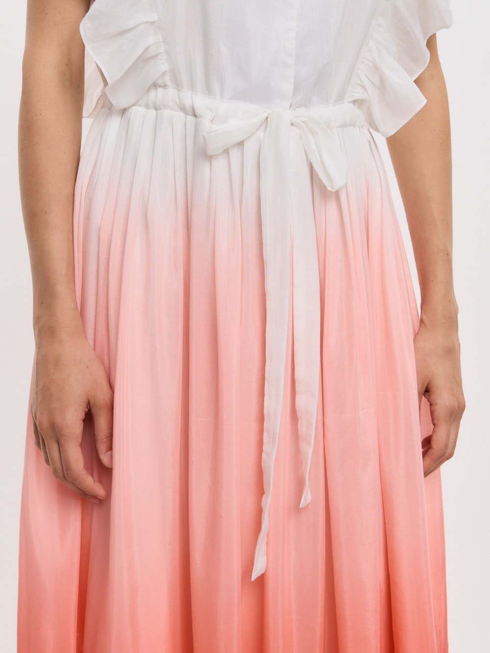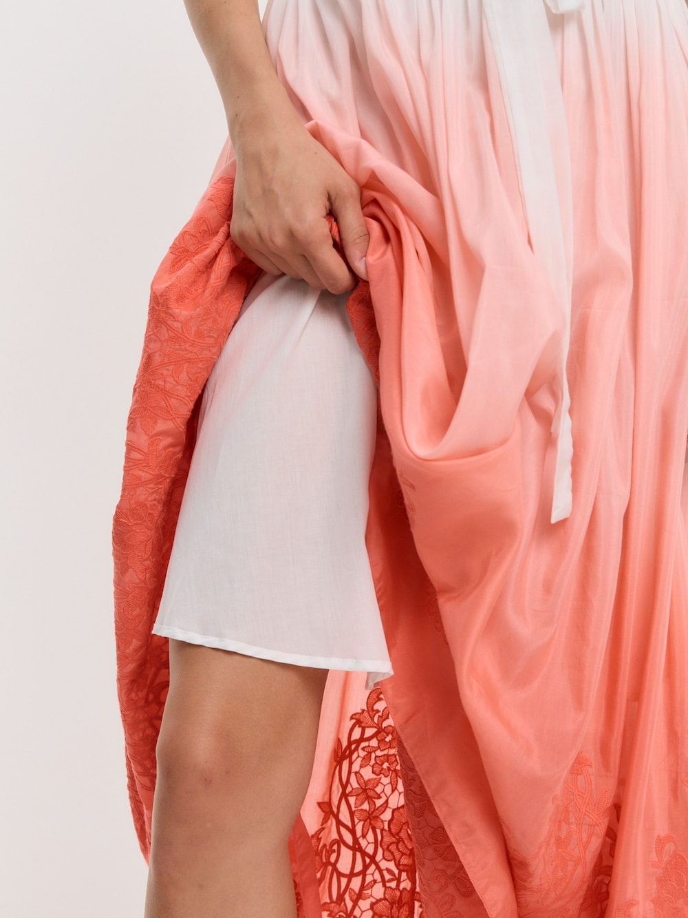 Шёлк с мягким бело-персиковым градиентом создаёт эффект нежного сияния и плавного движения, будто ткань растворяется в солнечном свете.